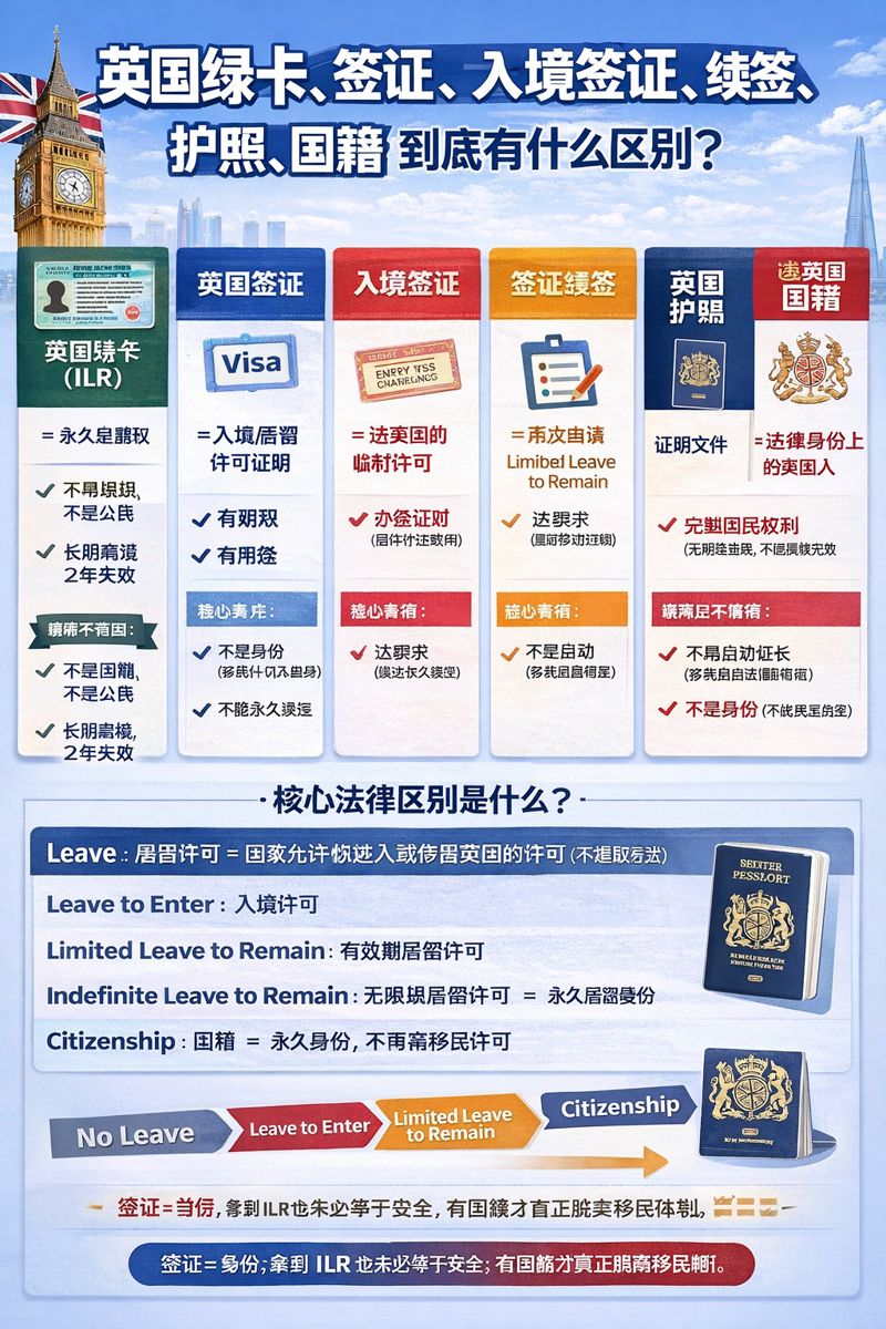 英国绿卡(ILR)、英国签证、入境签证、签证续签、英国护照、英国国籍有什么区别?本文用最清晰的逻辑,系统讲清英国身份与签证体系的核心差异。