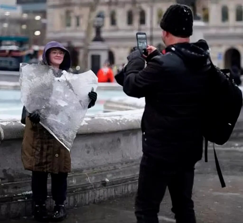 特拉法加广场上,有人干脆打起了雪仗。一位女士趁着雪势正盛,双手搓成一个不小的雪球,瞄准同伴就扔了过去。对方一边躲,一边笑得毫无形象。随后,她还直接从喷泉里捞出一大块冰,游客举着手机拍,鸽子缩在角落里,纳尔逊纪念柱在雪中显得格外安静。