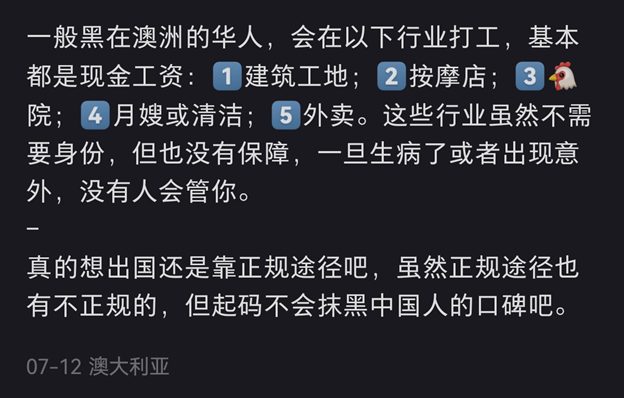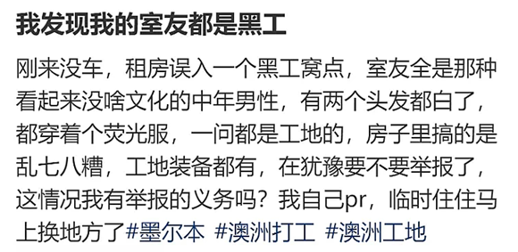该博主表示,“黑”在澳洲的国人基本上都从事一些体力劳动行业,而且生病了、出事了,也只能自己负责,并没有什么保障。