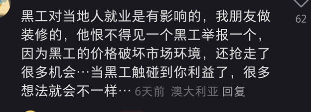 反方:他们出来也是被逼无奈,谁也不想受苦打黑工,这些同胞实在是没办法。在澳大利亚黑着的印度人、非洲人、中东人多了去了,人家的同胞们就很团结,根本不会有举报非法滞留同胞的事情发生。非但不举报,他们还会抱团向澳洲政府争取权利,非常心齐!只有国人会背后捅刀子,“老乡见老乡,背后打黑枪”地去举报同胞!