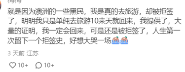 “就是因为澳洲的一些黑民,我是真的去旅游,却被拒签了,明明我只是单纯去旅游10来天就回来,我提供了大量的证明,我一定会回来,可是还是被拒签了,人生第一次留下一个拒签史,好想大哭一场。”